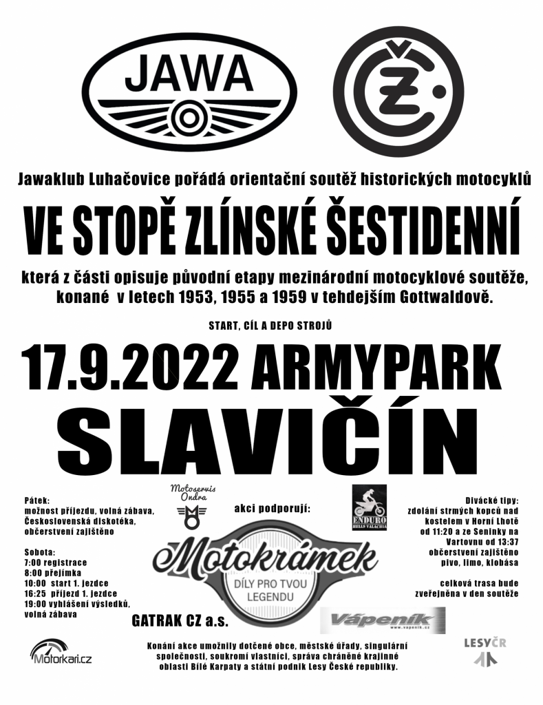 Jawaklub Luhačovice pořádá orientační soutěž historických motocyklů Ve stopě zlínské šestidenní, která z části opisuje původní trasy mezinárodní motocyklové soutěže. Start, cíl a depo strojů 17.9.2022 v Armyparku Slavičín.
